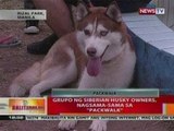 A Siberian husky looked amused by pressing its face against a glass window showing off his white teeth.