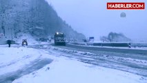 DÜZCE'de kar yağışı etkili oldu. Sürücüler araçlarıyla karla kaplı rampalarda ilerlemekte zorlandı.