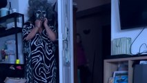 This dad decided to prank his son who was about to return home from school. He hid behind the door and jumped in front of him with a loud cry scaring the living daylights out of him as he entered through the door.