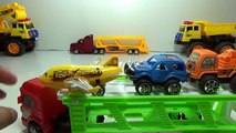 Long tronton truck transports toy police cars, offroad, fire engines, crocodiles, box trucks, racing cars, fish, crocodiles, bicycles, cows, dinosaurs, elephants, dump trucks, planes, oil cars, buffalo