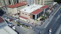 Esenyurt'ta iftara saatler kala fırın önündeki pide kuyruğu havadan görüntülendi.
