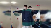 Antalya'da özel bir diyaliz merkezi çalışanları, koronavirüs salgını stresinden bunalınca, hasta yatağını gemi, paspasları kürek gibi kullanıp, Leonardo Di Caprio ve Kate Winslet'in gemi önündeki efsane pozunun verildiği o anı canlandırdı. (DHA)