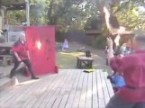 Un gars attrape des couteaux enflammé qu'on lui jette. Fou!