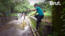 They spent around five minutes catching the snake and stuffing it into a sack before taking it back into the jungle far away from the village.