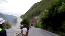 A huge rock was seen rolling down the mountain and crashing across a river and a road before coming to an abrupt stop.