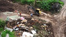 굵은 빗줄기가 쏟아지는 가운데 드론이 날아가 하얀 물체를 하천 건너편 남성에게 전달합니다.