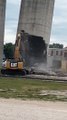 Its metal legs then begin to buckle under the weight as the structure comes crashing to the ground with workers desperately running to get out of its path.