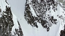 This skier jumped off a rock jutting out of the mountain. However, he could not make a perfect landing and tumbled down in the snowy mountain. He came to a stop finally and confirmed he was okay.