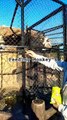 At Fayoum Zoo, A kid try to feed monkeys. he put a piece of banana on long iron bole to reach monkeys.