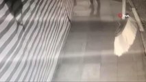 Güneş gözlüklü ve maskeli şüphelilerin binanın kapısını açma anlarına ait güvenlik kamerası görüntüsü