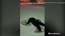 Police officers enjoy fresh snowfall