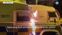 - Kuzey İrlanda’da Brexit sonrası yaşanan ticari kısıtlamalar ile ayrılıkçı Sinn Fein Partisi üyelerinin cenaze töreninde korona virüs tedbirlerini ihlal etmesine birlik yanlılarının tepkisiyle başlayan protestolarda dün gece maskeli grup, bir aracı ateşe verirken, polise molotofkokteyli ve taşla saldırdı. Birleşik Krallık’a bağlı Kuzey İrlanda’da Brexit sonrası yaşanan ticari engeller ve ayrılıkçı Sinn Fein partisi yetkililerinin bir cenaze töreni sırasında korona virüs tedbirlerini ihlal etmesine birlik yanlılarının tepki göstermesi sonucu başlayan şiddetli protestolarda tansiyon düşmüyor. Bazı bölgelerde İngiltere Kraliçesi II. Elizabeth'in eşi Prens Philip'in ölümü nedeniyle gösterilere ara verilirken, bazı noktalarda ise yapılan çağrılara kulak asmayan birlik yanlıları yine sokağa çıktı. Maskeli bir grup protestocu, park halindeki bir aracı ateşe verirken, polise molotof kokteyli ve taşlarla saldırdı. Çöp konteynerlerini yakarak yol kapatmaya çalışan protestoculara polis müdahale etmeye çalıştı. Bazı noktalarda polisin geri çekilmek zorunda kaldığı belirtildi. Ne oldu? Öte yandan geçtiğimiz hafta Savcılık, IRA üyesi Bobby Storey için 2 binden fazla kişinin katılımıyla düzenlenen cenazede bulunan 24 Sinn Fein üyesine karşı hiçbir işlem yapılmayacağını duyurmuştu. Birlik yanlıları ayrıca, Brexit anlaşması kapsamında yapılan Kuzey İrlanda Protokolü'ne de tepkili. Brexit'e rağmen Kuzey İrlanda'nın Avrupa Birliği'nin (AB) gümrük kurallarına tabi olması ile ortaya çıkan ticari kısıtlamaların ekonomiye zarar verdiği belirtiliyor.