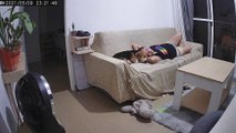 : "Kidlat the Beagle was having an intense dream which we think is about a burglar stealing his chicken. While sleeping, he barked and almost bit his mom, but later on, apologized after realizing he was only dreaming. Everything was caught on CCTV."