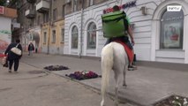 Prince Charming, with dinner in a box – Russian delivery man brings you pizza on horseback