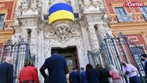 Una bandera de Ucrania ha sido desplegada en la fachada del Palacio de San Telmo de Sevilla