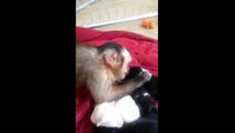 Monkey meets litter of puppies for the first time