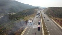 - Yanan yolcu otobüsü - Söndürme çalışmaları - Yolcuların konuşmalarıBURSA (AA) - Bursa 'da yolcu otobüsünde çıkan yangın, yolcular tahliye edilerek söndürüldü.Alınan bilgiye göre, Engin Yakış idaresindeki İstanbul'dan Marmaris'e giden 35 PK 138 plakalı yolcu otobüsünün, Gebze - Orhangazi - İzmir Otoyolu, Orhangazi tüneli çıkışında arka tekerleği patladı.Bu sırada tekerlek kısmında dumanlar yükselen otobüs yanmaya başladı.