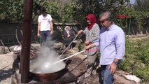 - Ağaçların silkelenmesi ve dutların toplanması - Toplanan dutlar - Dutların sıkılması ve kaynatılması - Tarım ve Orman İl Müdürü Nurettin Kıyas ile röportaj - Bölgeyi gezmeye gelen Alman turist Annetta Hanisch'ın konuşması - Çiftçilerden Mehmet Mustafa Büyüktaş'ın konuşması - Üreticilerden Medine Büyüktaş'ın konuşması - Dut sularının taşınmasıAdını yetiştirdiği duttan alan ilçede pekmez mesaisi başladı - Adıyaman 'ın Tut ilçesinde yetiştirilen urmu ve beyaz dutun hasadı sonrasında yapılan pekmezler, ilçe halkının önemli gelirleri arasında yer alıyor - Beyaz duttan yapılan pekmezler 40 - 60 lira arasında, urmu dut pekmezi ise 300 liradan satılıyor - Tarım ve Orman İl Müdürü Nurettin Kıyas; - "Bu yıl çiftçilerimize 5 bin urmu dut fidanı dağıtacağız. Böylece ilçemizi bir urmu dut merkezi haline getireceğiz"ADIYAMAN (AA) - ORHAN PEHLÜL - Türkiye'de halen birçok bölgede tarımsal üretimde kullanılmayan dut ağaçları, Adıyaman 'ın bu üründen ismini alan Tut ilçesinde halkın en önemli gelir kaynakları arasında yer alıyor.Şehir merkezine 60 kilometre uzaklıkta Hacı Muhammed Dağı'nın eteklerinde kurulu Tut ilçesinde, halkın en önemli gelir kaynağı olan duttaki hasat hummalı şekilde sürüyor.Kentteki yaklaşık 5 bin tonluk dut üretiminin yaklaşık yüzde 90'ı ilçede 1925 dekar alandaki dut ağaçlarından karşılanıyor.Hasat edilen dutlar, meyve olarak da satılırken bastık, pestil, lokum ve yüksek geliri nedeniyle pekmez olarak da değerlendiriliyor.Gübre ve ilaçlama yapılmadan organik üretilen dutlardan para kazanmaya başlayan vatandaşlar, bir yandan mevcut ağaçlara özenle bakarken diğer yandan da yeni dut bahçeleri oluşturuyor. - Dutlar bin bir zahmetle pekmeze dönüşüyorOlgunlaşan dutlar, toplanarak zahmetli bir yolculuğun ardından pekmeze dönüştürülüyor.Kadınların altına pamuktan yapılan tülleri gerdiği ağaca tırmanan bir kişi dallara vurarak dutların örtünün üzerine dökülmesini sağlıyor. Daha sonra tepsilere alınan dutlar, pamuklu tülden yapılan torbalarda ezilerek suları çıkarılıyor.Kazanlara konulan dut suyu, odun ateşinde yavaş yavaş kaynatılarak pekmez halini alıyor. Tekrar süzülüp tepsilere aktarılan pekmez, gerekli kıvama gelmesi için 3 gün güneş altında bekletilerek özel bidonlara alınıyor. Işık almayan odalarda ağızlarına tül gerilen bidonlarda 2 ay bekletilen pekmez tüketime hazır hale geliyor.Beyaz duttan üretilen pekmezin kilogramı 40 - 60, urmu dut pekmezi ise 300 liradan satışa sunuluyor. - İlçenin urmu dut üretiminde iddialı olması hedefleniyorTarım ve Orman İl Müdürü Nurettin Kıyas, AA muhabirine, ilçedeki dut yetiştiriciliğinin son yıllarda arttığını anlattı.Tut ilçesindeki dut yetiştiriciliğinin modern, profesyonelce ve ticari olarak yapıldığına işaret eden Kıyas, "Özellikle ilçemizde beyaz dut dışında urmu dut olarak da yetiştiricilik artmakta. Özellikle pandemi de urmu duta vatandaşlar yönelim gösterdiler. Şu an dut hasadı sürüyor, üreticilerimiz bunların pekmezlerini yapmaktalar." diye konuştu.
