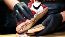 The Cobblers is a shoe-repair shop in Miami. Their team shows us how they restore the midsole on a pair of Air Jordan 4 Retro sneakers by removing the old cracking paint, cleaning the midsole, applying base layers of white paint, and painting the midsole back to its original color.