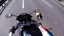 A motorcyclist helps catch a dog running along a road