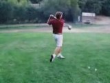 Guy Swings Golf Club, It Breaks and Part Strikes Cart