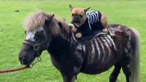 A group of bulldogs dressed in different costumes for Halloween was hanging out in the yard. They looked adorable in their outfits and headgears. One of them wasn't a big fan of the headgear and they succeeded in shaking it off themselves.