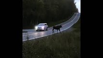 Moose Slips and Falls in Front of Car