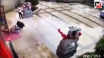 Çöp konteyneri faciaya neden oluyordu... Hızla giden çöp konteynerini gördü, tehlikeyi tekme ile savuşturdu