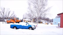 : The video was taken on Highway 16 at the noted location. Both the truck and train are owned by Canadian Pacific Railway. The truck was stuck on a passable roadway shortly after a large dump of snow in the area. The train happened to be in the right place at the right time and the crew used what was available - a train. It seemed ironic in that the train dwarfed the truck and it was overkill but at the time seemed very Canadian given the situation at hand.