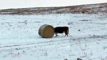 Une vache joue avec une botte de foin ...