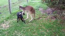 Un kangourou prend soin d'un chien d'une manière un peu ambigue