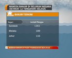 Perkembangan banjir. Setakat 4 petang Rabu, 5,696 mangsa daripada 1,522 mangsa ditempatkan di 28 pusat pemindahan. Sedikit penurunan berlaku di Sarawak berbanding pagi tadi dengan 5,551 daripada 1,489 keluarga ditempatkan di 25 pusat pemindahan.