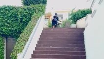 Guy rides bike down hill into parking lot and hits his head while hanging on height bar