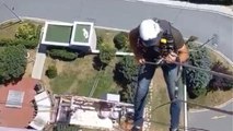 Metrelerce yükseklikte mahsur kalan iki işçi vinçle kurtarıldı.
