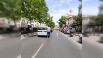 Olay, kentin en işlek caddesi olan Gazi Caddesi ile Vali Fahribey Caddesi arasında meydana geldi. Elektrikli bisikletin arkasına tutunarak giden kız, bir süre kırmızı ışıkta bekledikten sonra tehlikeli yolculuğuna devam etti. Kızın pateniyle, trafiğin yoğun olduğu bölgede bisikletin arkasına tutunarak yolculuk etmesi ise görenleri şaşkına çevirdi. Patentli kız bir süre sonra gözden kayboldu. Haber
