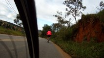 Aerial shot of a mountain bikers riding to the edge of the ridge, stopping and raising his hands in victory over the valley beneath him. ₹
