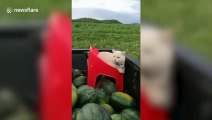 Angry cat with a fierce scowl guards farmer's watermelons