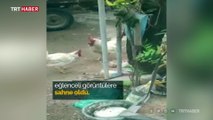 Kavga Eden Horozları Ayırmaya Çalışan Yavru Köpeğin Çabası Güldürdü