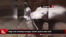 Bağlı olan arkadaşı buzağıyı sürekli ziyaret eden kedi