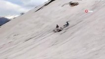 Araçlarına bağladıkları rafting botuyla kar üstünde kayarak eğlendiler