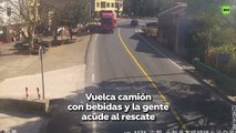 Vuelca un camión con bebidas en China y la gente se apresura a ayudar