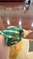 : "I put Nudacris in his harness for the first time, and he was not thrilled!"