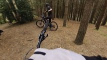 This biker did a successful run through a bike track where they also rode over inclines, performed jumps, and rode on tricky trails. They were able to get through all these with ease cand control.