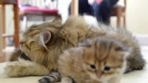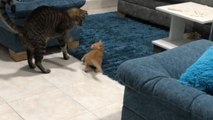 Grumpy cat keeps avoiding the adopted kitten who only wants to play