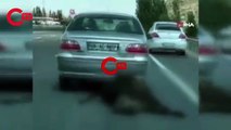 Olay, dün Bekilli ilçe merkezinde meydana geldi. Cadde üzerinde hareket halindeki otomobilin arkasına zincirle bağlı şekilde yolda sürüklenen köpeği gören vatandaşlar cep telefonuyla görüntüledi.