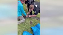 Three police officers worked together to remove a bobcat that had become stuck in a car’s grille in Plover, Wisconsin, on Tuesday (18 April).