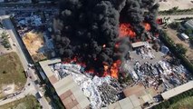 MANİSA - Manisa'da Tekeli Geri Dönüşüm Fabrikasının bahçesinde çıkan yangın fabrikanın idari binasına da sıçradı. Rüzgarın etkisiyle ekiplerin yangına müdahalesi zorlaşırken, yangına havadan ve karadan müdahale devam ediyor. Yer yer patlama seslerinin duyulduğu yangının çevre fabrikalara sıçramaması için ekiplerin yoğun çalışması devam ediyor.