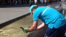 Taksim'de sıcaktan bunalan güvercine belediye işçisinden yardım eli