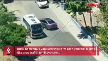 Tuzla’da minibüs yolu üzerinde drift atan yabancı plakalı lüks araç trafiği tehlikeye soktu. Drift esnasında seyir halindeki taksiye çarpmaktan kıl payı kurtulan sürücüyü vatandaşlar cep telefonu kamerasıyla kayda aldı.