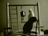 : Video of playful native Australian parrots, known as corellas, a smaller variety of the more well-known cockatoos, playing at a park located in the regional country town of Armidale NSW Australia. Armidale is home to thousands of these parrots and the locals have come to accept the playfulness of the corella population even though the birds can be annoying as they do loud flyovers across the town several times a day. The birds are taking turns swinging on a seesaw/teeter-totter-like device. As one bird gets on, the device raises and lowers on the other side as another bird tries to hang on.